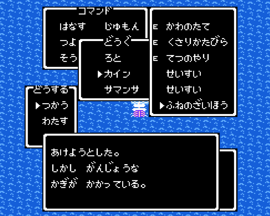 「つかう」を選ぶと宝箱を開けようとするが、鍵がかかっていて開かないらしい。