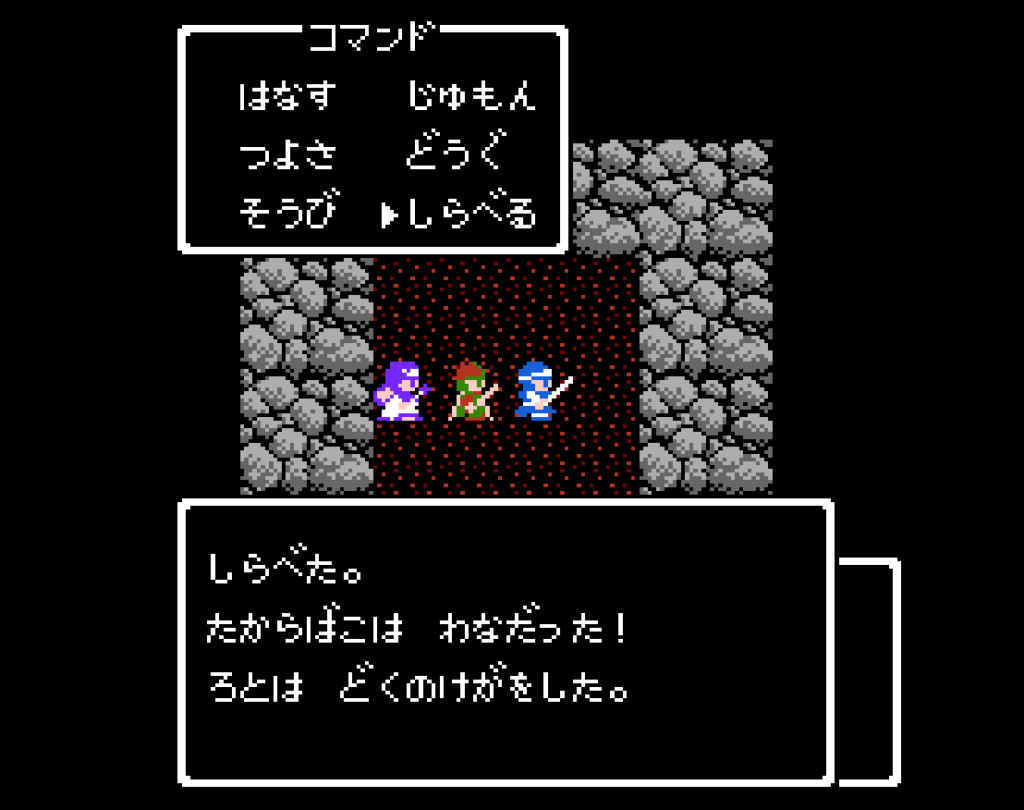 ここで初めて、宝箱の罠!どくのけがをした!